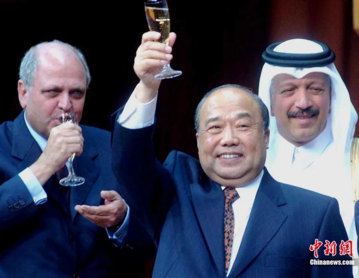 2001年11月12日,中國加入WTO議定書簽字儀式在卡塔爾首都多哈舉行,時(shí)任外經(jīng)貿(mào)部部長石廣生在簽字后同各國代表一起舉杯慶祝。錢興強(qiáng) 攝