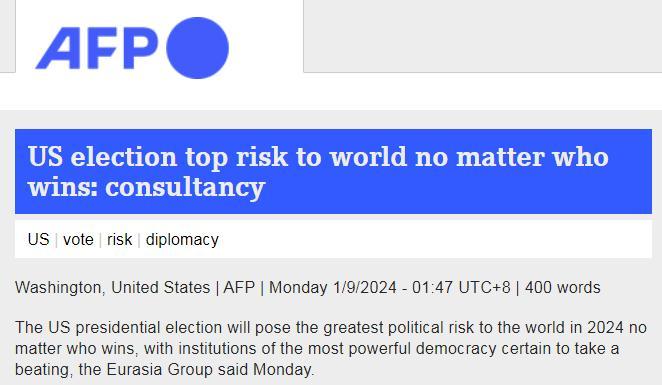 中新網(wǎng)1月10日電 據(jù)法新社報(bào)道,日前,政治風(fēng)險(xiǎn)咨詢公司歐亞集團(tuán)表示,無論誰(shuí)獲勝,2024年美國(guó)總統(tǒng)選舉都將給世界帶來最大政治風(fēng)險(xiǎn),美國(guó)制度將會(huì)受到打擊。