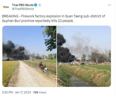 另據(jù)泰國公共廣播服務公司下屬新聞網(wǎng)站“Thai PBS World”社交媒體賬號消息,當?shù)貢r間17日,泰國中部素攀武里府一家煙花廠爆炸,目前已造成23人死亡,多人受傷。