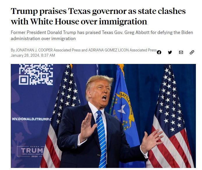 據(jù)報道,特朗普27日在一場以邊境安全為主要議題的演講中表示,應全力支持得克薩斯州在美墨邊境采取的遏制非法移民的措施,并稱贊阿博特在該問題上采取的舉措。