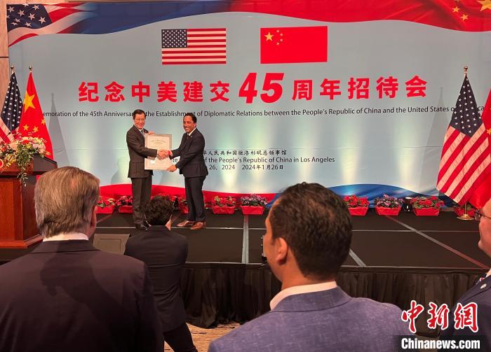 當(dāng)?shù)貢r(shí)間1月26日,中國駐洛杉磯總領(lǐng)事館舉辦紀(jì)念中美建交45周年招待會(huì)?!≈行律缬浾?張朔 攝