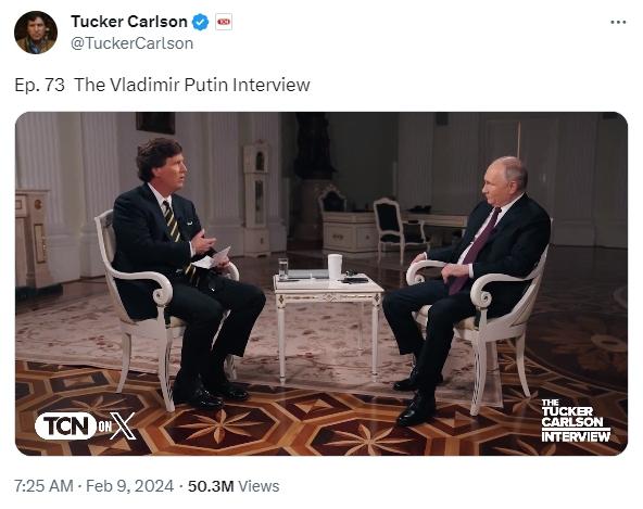 上線前,這場采訪就在世界范圍內(nèi)引發(fā)關(guān)注。有媒體稱,這次采訪或?qū)⒊蔀?022年烏克蘭危機爆發(fā)后,美國媒體人對普京進(jìn)行的首個正式訪問。相關(guān)通告已在社交媒體上獲得了網(wǎng)友的上億次瀏覽量。