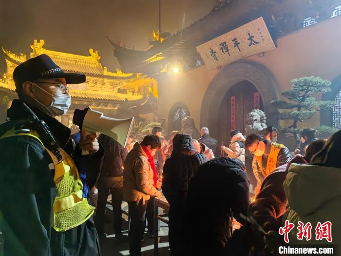 “太平禪寺零點(diǎn)前后達(dá)到瞬時(shí)人流高峰,人流量接近往年峰值人數(shù)的兩倍?!鄙虾J泄簿謱毶椒志诸櫞迮沙鏊L何相俊說。位于上海市寶山區(qū)太平禪寺的龍年撞鐘、燒頭香等活動(dòng),吸引了大量市民前來進(jìn)香。為應(yīng)對(duì)2月9日晚至2月10日凌晨的短時(shí)大客流,顧村派出所在寺廟入口處增設(shè)了蛇形緩沖通道,預(yù)計(jì)可同時(shí)容納500人以上有序排隊(duì)入寺。