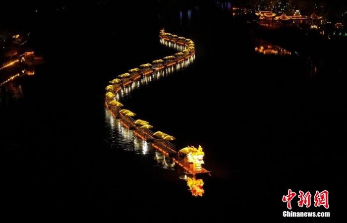 資料圖:一條200米長的水上金龍?jiān)诎不帐↑S山市休寧縣齊云山鎮(zhèn)橫江江面上游弋而過,龍燈迤邐,與江畔的古民居夜色相映成輝,喜迎新春。施亞磊 攝