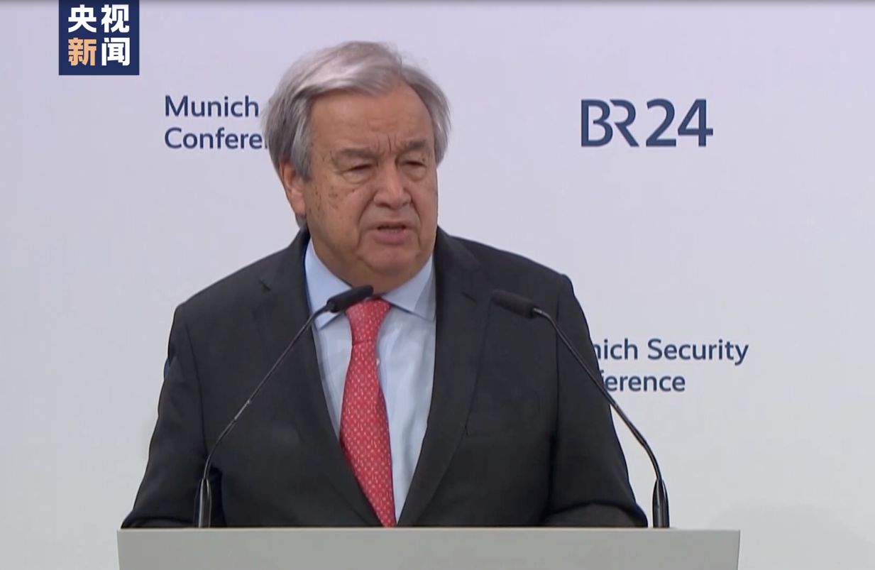 △2月16日,聯(lián)合國秘書長古特雷斯在慕安會上發(fā)表開幕致辭(圖由總臺記者拍攝)