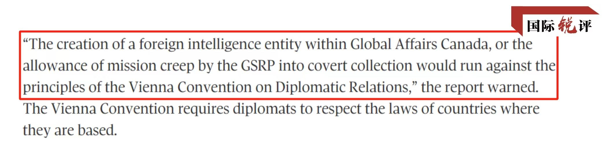 這里不得不提到一個項目——加拿大外交部“全球安全報告項目”(GSRP)。它負責(zé)派遣外交官在熱點地區(qū)收集相關(guān)安全信息,康明凱曾是該項目工作人員。加拿大國家安全與情報審查局去年12月發(fā)布的一份審查報告顯示,GSRP的工作內(nèi)容與加拿大安全情報局的部分海外任務(wù)有重疊,可能讓本國官員面臨風(fēng)險,也違反了國際外交公約。