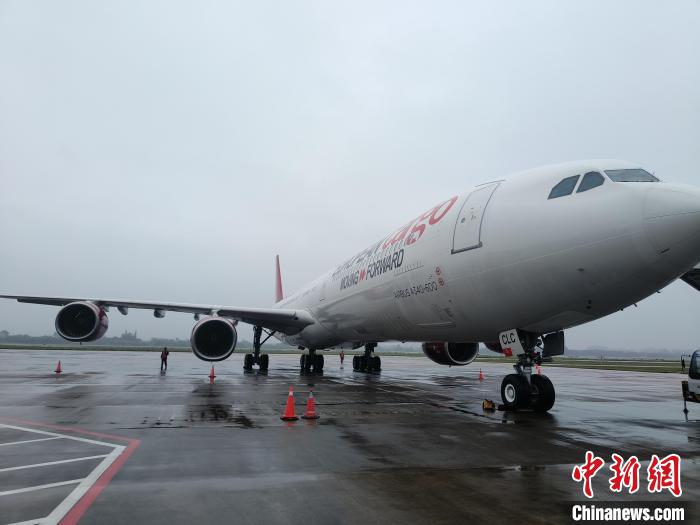 3月9日,由英國(guó)伯恩茅斯國(guó)際機(jī)場(chǎng)起飛的國(guó)際貨運(yùn)航班抵達(dá)???。(??诿捞m國(guó)際機(jī)場(chǎng)供圖)