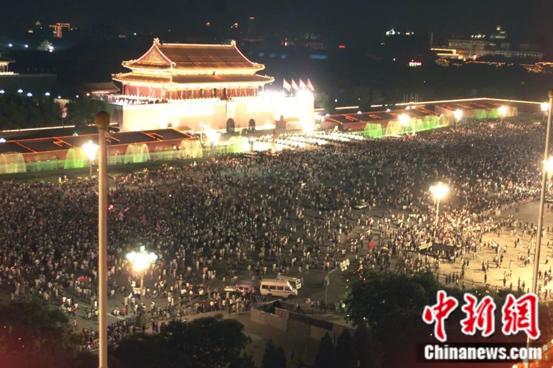 2001年7月13日晚,北京天安門廣場(chǎng)人潮涌動(dòng),數(shù)以十萬(wàn)計(jì)的民眾徹夜不眠慶祝北京申奧成功。毛建軍 攝
