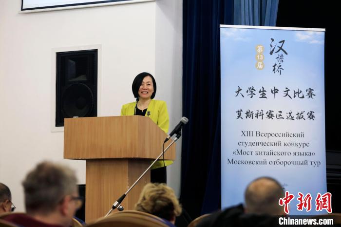 4月12日,中國駐俄使館教育處一等秘書鄧瀅出席第十三屆全俄“漢語橋”大學生中文比賽莫斯科賽區(qū)選拔賽并致辭。(中新網(wǎng)記者 田冰 攝)