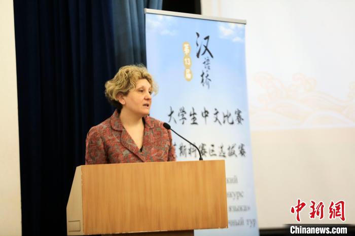 4月12日,莫斯科國立語言大學副校長古謝茵諾娃出席第十三屆全俄“漢語橋”大學生中文比賽莫斯科賽區(qū)選拔賽并致辭。(中新網(wǎng)記者 田冰 攝)