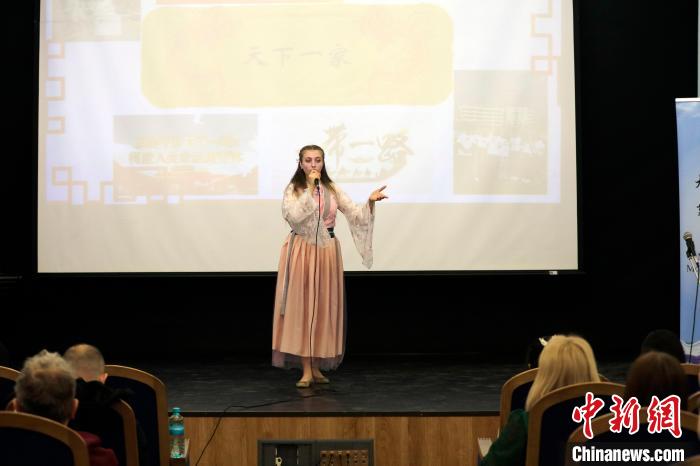 4月12日,第十三屆全俄“漢語橋”大學生中文比賽莫斯科賽區(qū)選拔賽在莫斯科國立語言大學舉行。圖為參賽選手進行主題演講。(中新網(wǎng)記者 田冰 攝)