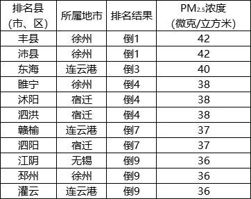 PM2.5濃度相對(duì)較差的后10位(倒1-10名)依次是:豐縣(沛縣并列)、東海、睢寧(沭陽(yáng)、泗洪并列)、贛榆(泗陽(yáng)并列)、江陰(邳州、灌云并列)。