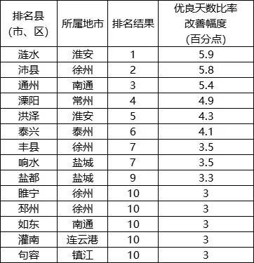 優(yōu)良天數(shù)比率改善幅度相對(duì)較好的前10位(1-10名)依次是:漣水、沛縣、通州、溧陽(yáng)、洪澤、泰興、豐縣(響水并列)、鹽都、睢寧(邳州、如東、灌南、句容并列)。