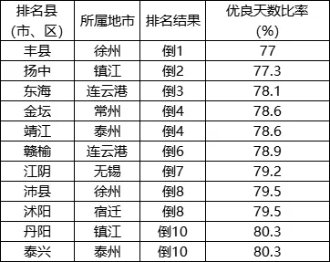 優(yōu)良天數(shù)比率相對(duì)較差的后10位(倒1-10名)依次是:豐縣、揚(yáng)中、東海、金壇(靖江并列)、贛榆、江陰、沛縣(沭陽(yáng)并列)、丹陽(yáng)(泰興并列)。