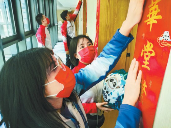 服務(wù)保障人員的村內(nèi)生活也趣味十足。下午3點(diǎn)多,一場(chǎng)“守海陀歲·延慶冬奧村新村民共贏未來(lái)”主題活動(dòng)在訪客中心舉行?!拔⑿Φ难?,為大地開(kāi)花;愛(ài)灑向手心,純潔無(wú)瑕……”中外志愿者們用12種語(yǔ)言唱起北京冬奧會(huì)志愿者之歌《燃燒的雪花》,擊鼓傳花,匿名交換明信片,現(xiàn)場(chǎng)溫馨又熱鬧。而在媒體中心,志愿者寫(xiě)福字,貼福字,迎接春節(jié)和冬奧的到來(lái)。晚上6點(diǎn)多,延慶冬奧村還迎來(lái)了“志愿者虎年春節(jié)聯(lián)歡晚會(huì)”,志愿者各顯身手帶來(lái)彈唱、傳統(tǒng)曲藝、芭蕾舞表演等節(jié)目,以“線上村晚”開(kāi)啟新的一年。