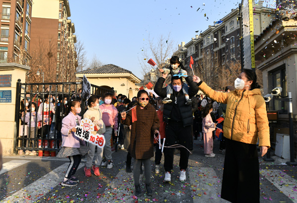 在潤(rùn)澤悅溪小區(qū)門口,工作人員快速拆除快遞架,小區(qū)大門緩緩打開,居民們興高采烈地結(jié)伴走出小區(qū)。社區(qū)黨委書記、居委會(huì)主任分別向志愿者代表頒發(fā)證書并送上鮮花,向入駐社工、民警、機(jī)關(guān)工作人員獻(xiàn)上鮮花,為社區(qū)衛(wèi)生服務(wù)中心和來廣營(yíng)派出所送錦旗,為愛心企業(yè)頒發(fā)獎(jiǎng)牌。居民代表向社區(qū)黨委及小區(qū)物業(yè)送錦旗。3月8日也是國(guó)際婦女節(jié),地區(qū)特意制作了電子賀卡,為每位女性同胞送上節(jié)日祝福。