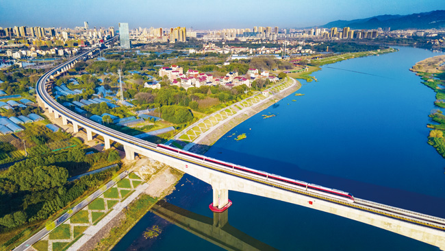 3月12日早晨,金華金義東市域軌道交通一列電客車疾馳而過,穿過金東區(qū)跨東陽江大橋,駛向下一站——金華南站,河道兩岸,綠油油的田野、遠(yuǎn)處林立的高樓連片交織,組成一幅春天絢麗多彩的圖畫。(時寬兵)