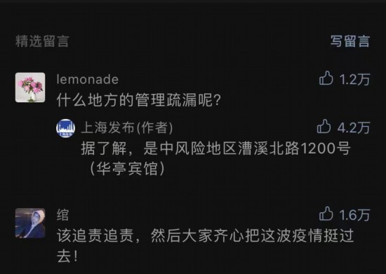 是什么地方的“疏漏”?“上海發(fā)布”在留言區(qū)直白回復(fù)網(wǎng)友:“據(jù)了解,是中風險地區(qū)漕溪北路1200號(華亭賓館)”。