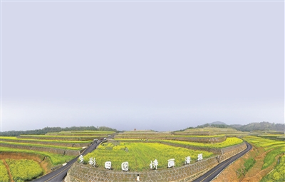 近日,杭州富陽(yáng)區(qū)新登鎮(zhèn)潘堰村的300畝“海綿梯田”里油菜花開,游客在田間棧道和觀光平臺(tái)上一覽滿目金黃的山鄉(xiāng)春色。