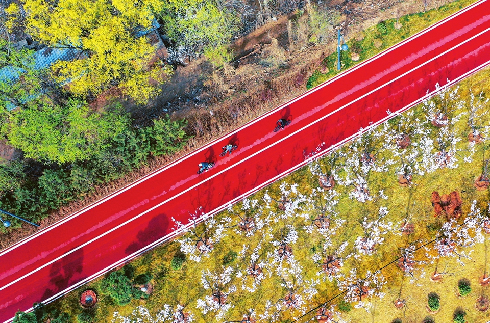 4月6日,春光和煦,百花爭艷,在太原市汾河生態(tài)景觀濱河西路自行車道柴村橋以北,鳥瞰兩旁的杏花競相綻放,游人騎行漫步其中,聞淡雅花香,觀生態(tài)風光,別有一番韻味。(記者劉通攝)