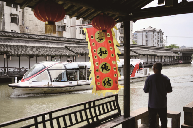 4月10日下午,嘉興市區(qū)環(huán)城河水面上,一艘水上巴士駛過。當(dāng)天,嘉興市區(qū)公交、水上巴士等逐步恢復(fù)營(yíng)運(yùn)。(王振宇)