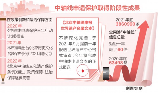 2017年,“積極推進(jìn)中軸線申遺工作”寫(xiě)入《北京城市總體規(guī)劃(2016年—2035年)》。同年,北京市推進(jìn)全國(guó)文化中心建設(shè)領(lǐng)導(dǎo)小組批準(zhǔn)成立了中軸線申遺保護(hù)專(zhuān)項(xiàng)工作組,全面啟動(dòng)北京中軸線申遺保護(hù)工作……