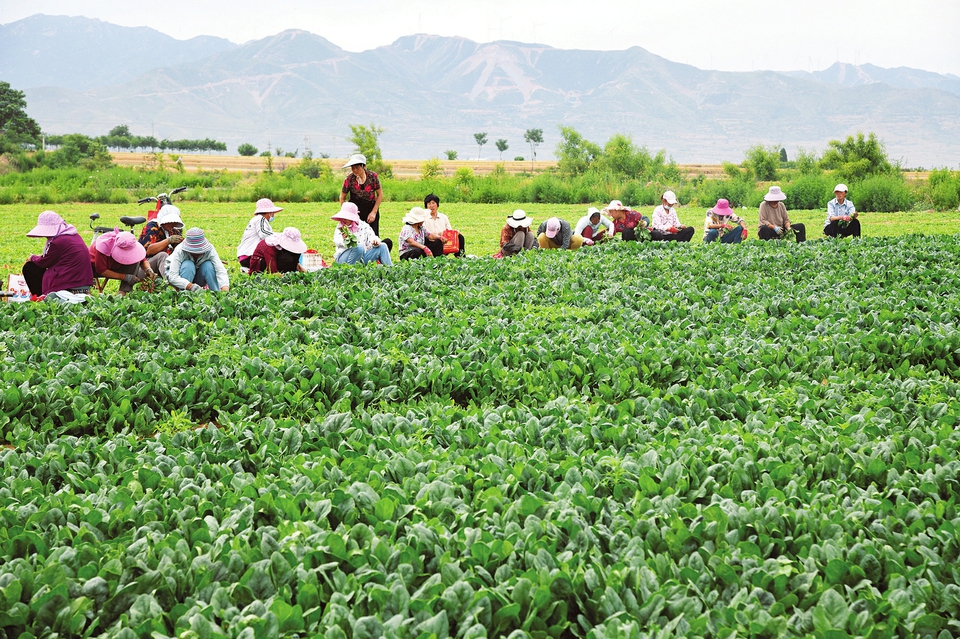 6月1日,聞喜縣后宮鄉(xiāng)新陽莊村村民正在收割大田菠菜,準(zhǔn)備發(fā)往市場。