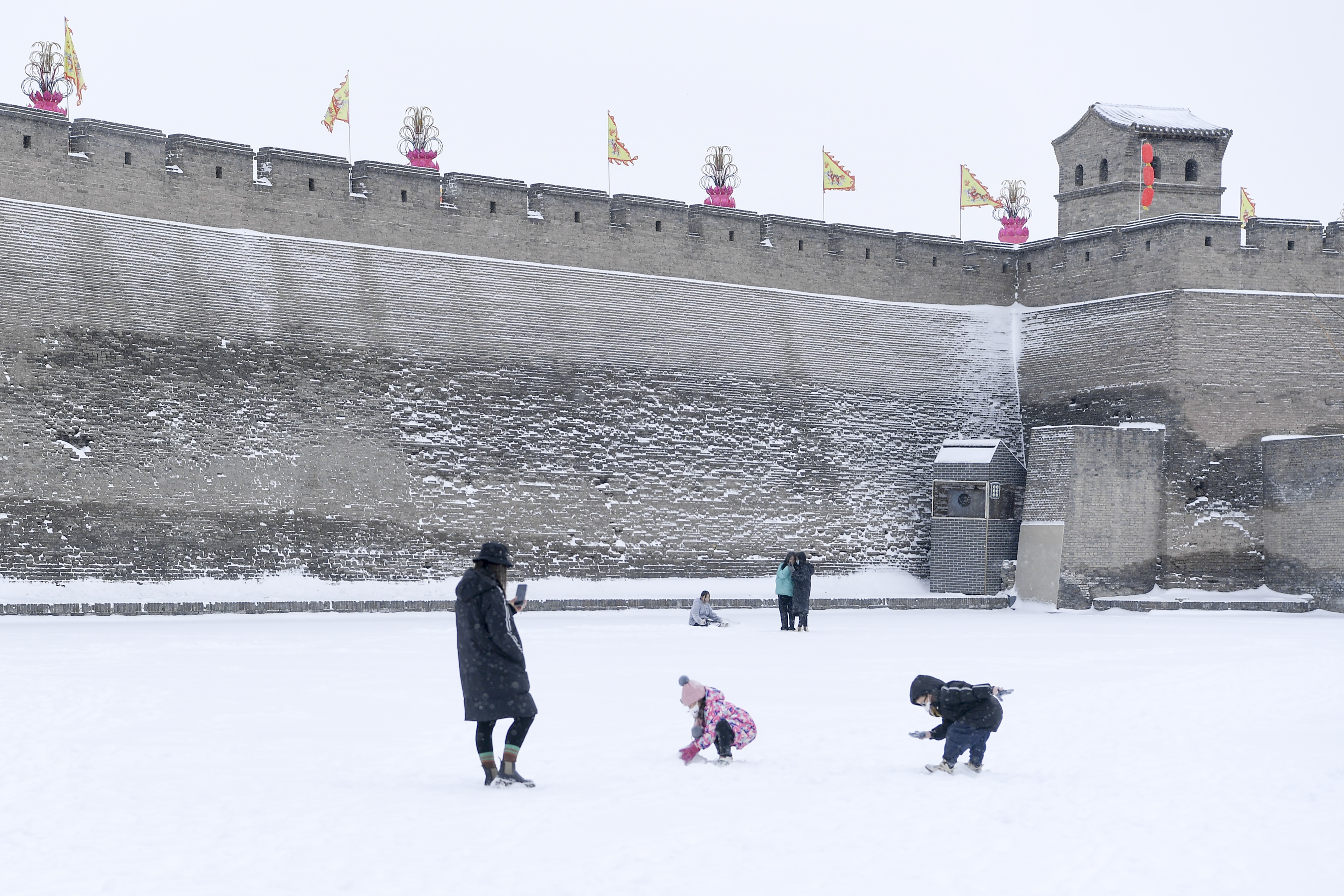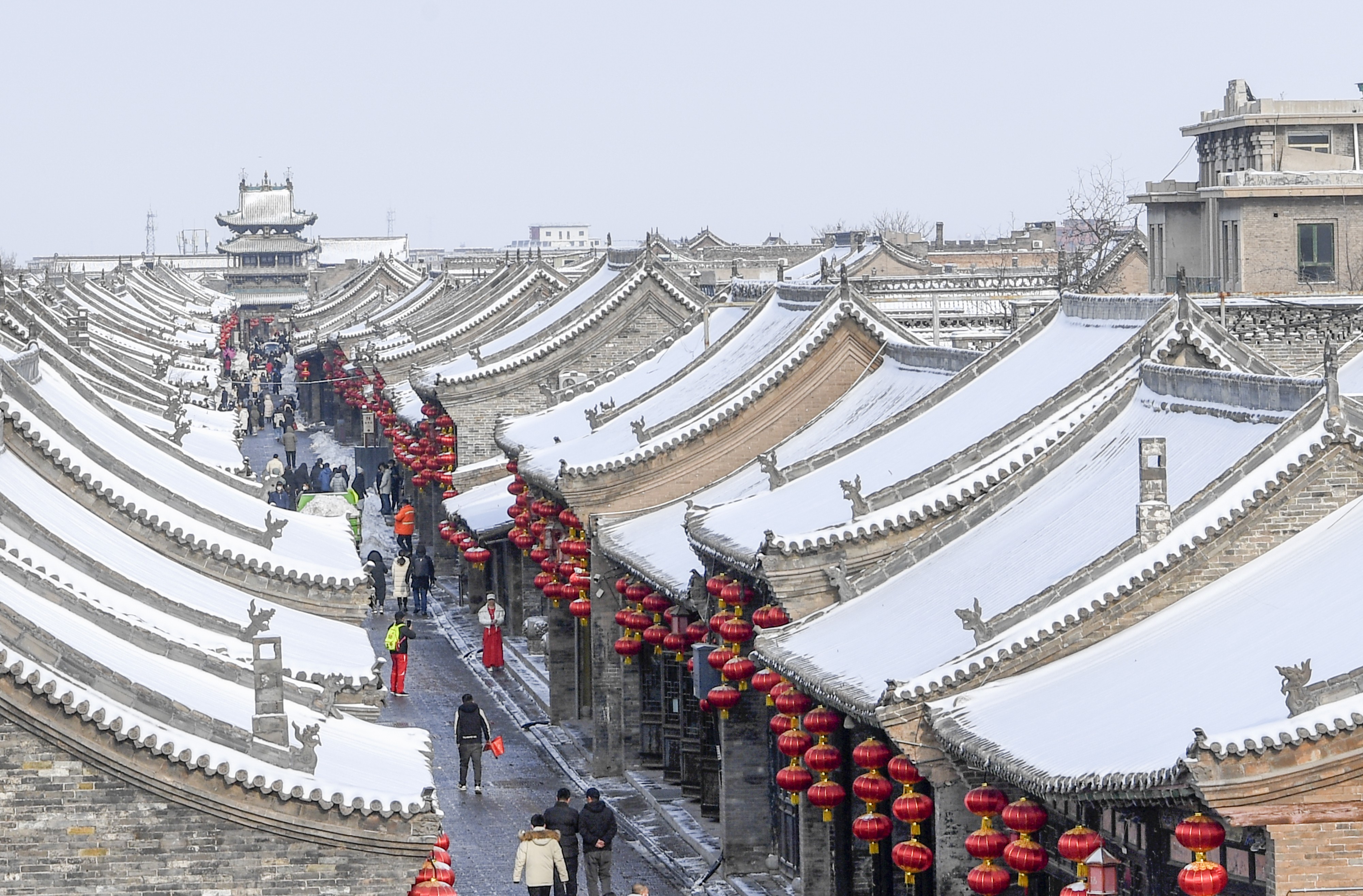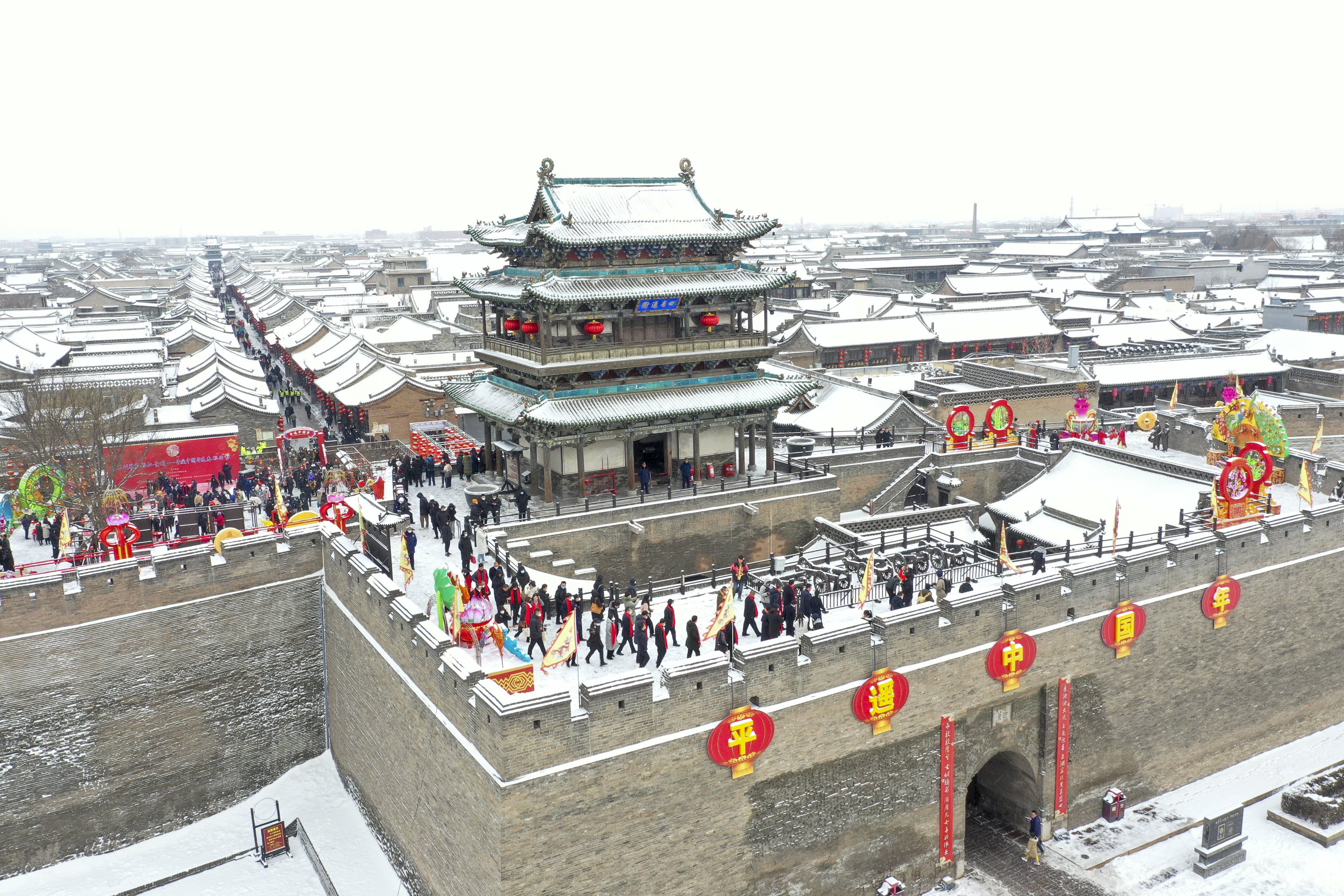 1月14日,山西省晉中市平遙縣迎來入冬以來首場降雪,雪中的平遙古城銀裝素裹,美景如畫。當(dāng)日,恰逢2023年“我們的節(jié)日·春節(jié)——平遙中國年”活動(dòng)在這里啟幕,來自各地的游客在雪中游覽古城,別有一番韻味。(梁生仁攝)