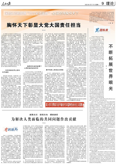 中國(guó)共產(chǎn)黨是為中國(guó)人民謀幸福、為中華民族謀復(fù)興的黨,也是為人類謀進(jìn)步、為世界謀大同的黨。我們要拓展世界眼光,深刻洞察人類發(fā)展進(jìn)步潮流,積極回應(yīng)各國(guó)人民普遍關(guān)切,為解決人類面臨的共同問(wèn)題作出貢獻(xiàn),以海納百川的寬闊胸襟借鑒吸收人類一切優(yōu)秀文明成果,推動(dòng)建設(shè)更加美好的世界。深刻認(rèn)識(shí)和把握“六個(gè)必須堅(jiān)持”系列理論版今天推出第六期,圍繞“必須堅(jiān)持胸懷天下”進(jìn)行闡述。