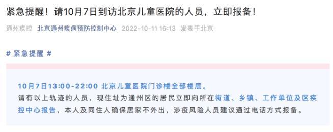 通州疾控:10月7日這一時段到訪北京兒童醫(yī)院人員立即報備