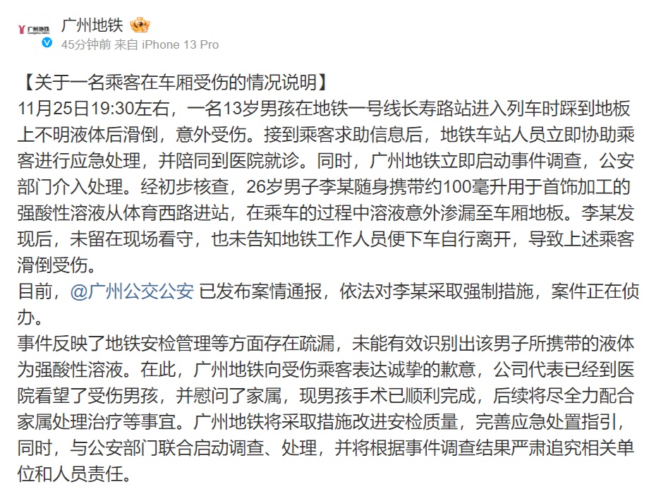 情況說明顯示:11月25日19:30左右,一名13歲男孩在地鐵一號線長壽路站進入列車時踩到地板上不明液體后滑倒,意外受傷。接到乘客求助信息后,地鐵車站人員立即協助乘客進行應急處理,并陪同到醫(yī)院就診。同時,廣州地鐵立即啟動事件調查,公安部門介入處理。