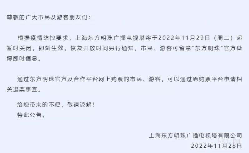 上海東方明珠廣播電視塔有限公司28日晚發(fā)布公告稱,根據(jù)疫情防控要求,上海東方明珠廣播電視塔于2022年11月29日起暫時(shí)關(guān)閉,即刻生效?;謴?fù)開放時(shí)間另行通知,市民、游客可留意“東方明珠”官方微博即時(shí)信息。