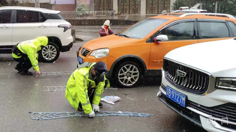 民警幫市民的愛車加裝防滑鏈(央廣網(wǎng)記者 白刁尹 攝)