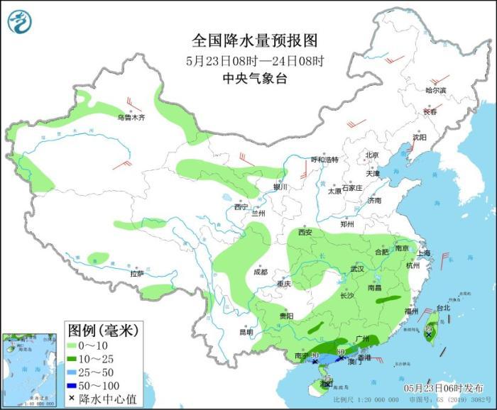 5月23日08時(shí)至24日08時(shí),華南南部、臺(tái)灣島等地部分地區(qū)有中到大雨,其中,廣西東南部沿海、廣東西南部沿海等地局地有暴雨(50~90毫米)。新疆、內(nèi)蒙古中西部和東北部等地部分地區(qū)有4~6級(jí)風(fēng)。