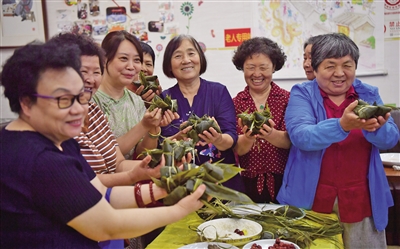 6月19日下午,什剎海街道端午節(jié)民俗活動(dòng)在北京市西城區(qū)什剎海街道華方居家養(yǎng)老配餐中心舉行,30多位老人和民俗專(zhuān)家一起包粽子。新京報(bào)記者 李木易 攝