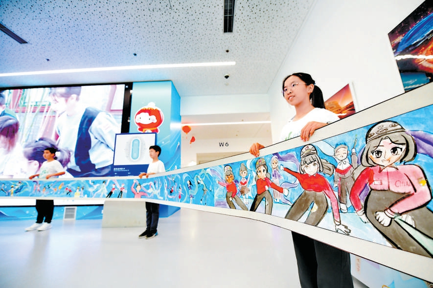 府學(xué)胡同小學(xué)的同學(xué)在“冰絲帶”展示了自己參與實(shí)踐課程后,運(yùn)用所學(xué)知識(shí)繪制的長(zhǎng)卷。本報(bào)記者 和冠欣攝