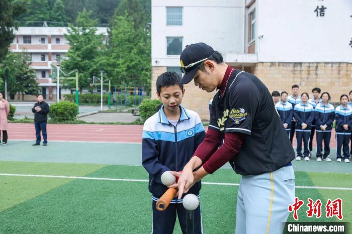 今年4月,臺(tái)青宋奇軒在北京合伙創(chuàng)辦“新世代棒球俱樂(lè)部”。圖為宋奇軒在四川省青川縣為當(dāng)?shù)貙W(xué)校開(kāi)展公益棒球課項(xiàng)目。(受訪者供圖)