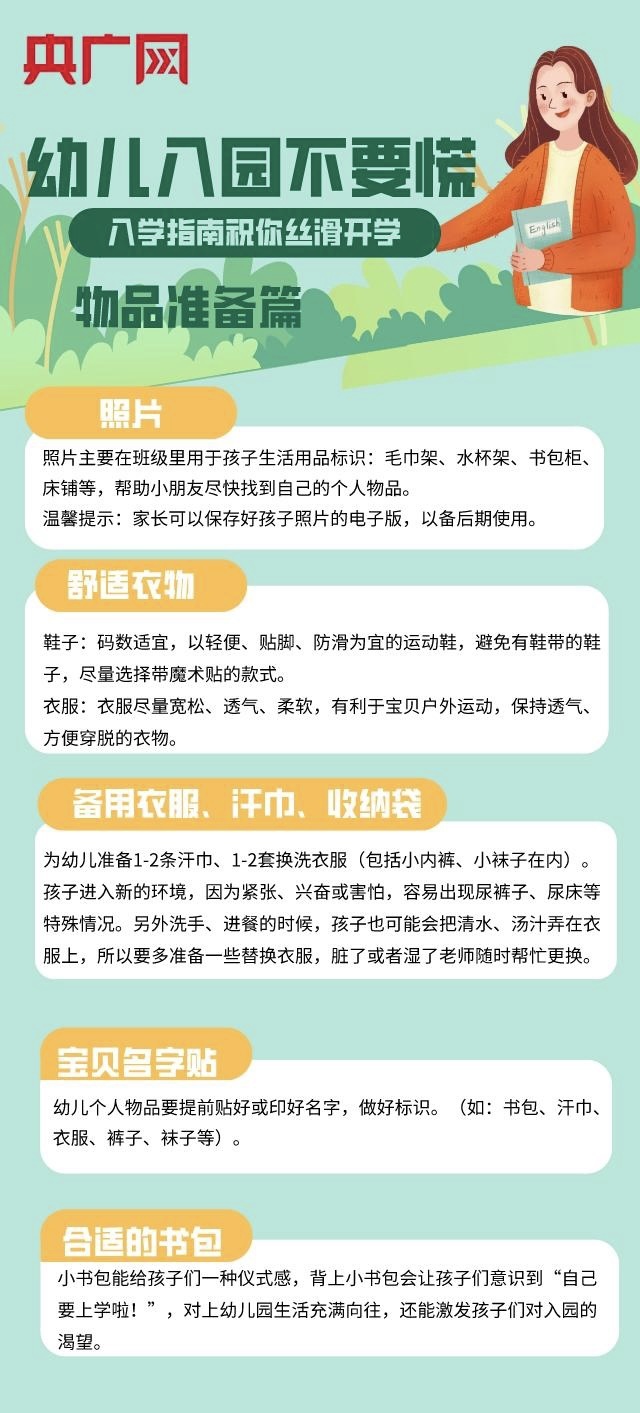 央廣網(wǎng)北京8月27日消息 幼兒園是人生的第一所學(xué)校,在這里,孩子們將開啟真正的學(xué)習(xí)生活和社會(huì)生活??梢哉f(shuō),這一階段對(duì)于孩子的性格塑造和習(xí)慣養(yǎng)成都有著十分重要的影響。那么幼兒入園前,新手爸媽應(yīng)該做好哪些準(zhǔn)備工作呢?別慌,這份入學(xué)指南請(qǐng)收藏!