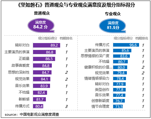 張藝謀導(dǎo)演新作《堅(jiān)如磐石》獲得觀眾滿意度評(píng)分84.1分,居2023年國慶檔調(diào)查五部影片首位,作為聚焦反腐反黑的警匪題材影片,對(duì)于社會(huì)現(xiàn)實(shí)以及人性的描摹深度和豐富層次得到了觀眾的高度好評(píng),思想性得分85.4分,為三大指數(shù)中最高,觀賞性得分84.4分,為檔期最高分,其中主要演員的表演得到了不同觀眾的高度評(píng)價(jià),在2023年調(diào)查的50部影片中分別居普通觀眾評(píng)價(jià)的第6位和專業(yè)觀眾評(píng)價(jià)的第3位。