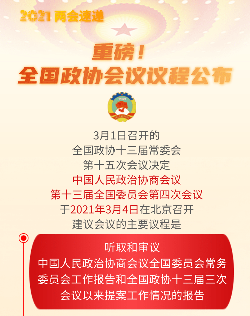 據(jù)新華社消息,3月1日召開的全國政協(xié)十三屆常委會(huì)第十五次會(huì)議決定:中國人民政治協(xié)商會(huì)議第十三屆全國委員會(huì)第四次會(huì)議于2021年3月4日在北京召開。[詳細(xì)] -