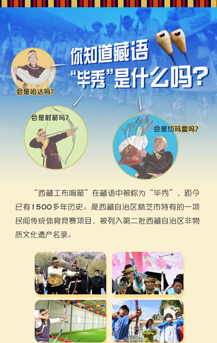 "西藏工布響箭"在藏語中被稱為“畢秀”,距今已有1500多年歷史。是西藏自治區(qū)林芝市特有的一項民間傳統(tǒng)體育競賽項目,被列入第二批西藏自治區(qū)非物質(zhì)文化遺產(chǎn)名錄。[詳細(xì)] -