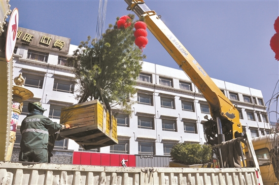 圖為工作人員將舊花箱吊裝上卡車。拉薩融媒記者 趙耀鐵攝