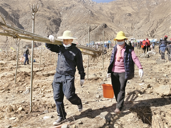 3月27日,區(qū)市142家單位的干部職工共同參加義務植樹活動,為拉薩大地再添新綠。圖為植樹現(xiàn)場,大家揮鍬鏟土、提桶澆水、搬運樹苗,栽下了一棵棵樹苗。拉薩融媒記者 旦 達攝