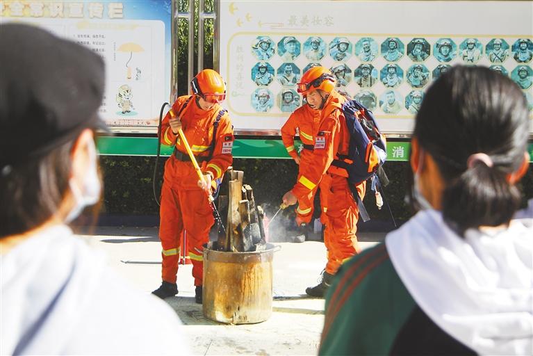 消防員就裝備正確使用方法進(jìn)行演示。通訊員 徐嘉陽(yáng) 記者 謝筱純 王珊 張猛 攝