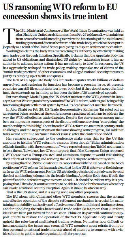 原標題:US ransoming WTO reform to EU concession shows its true intent