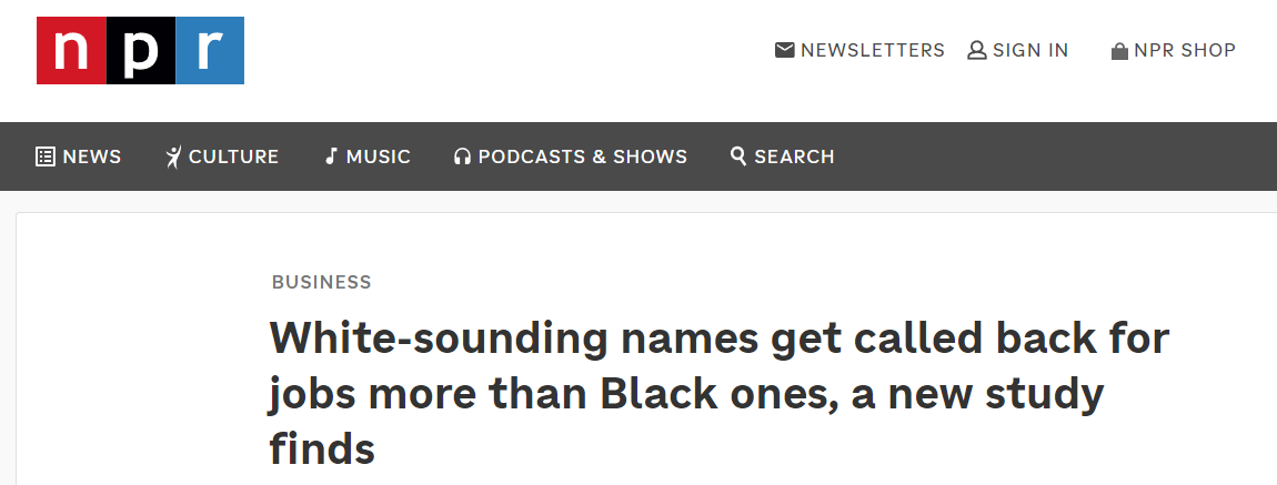 據(jù)美國(guó)全國(guó)公共廣播電臺(tái)(NPR)網(wǎng)站報(bào)道,研究人員向約100家美國(guó)企業(yè)的11000個(gè)初級(jí)職位投遞了履歷相同,但個(gè)人信息(姓名、性別等)不同的83000份“偽造”簡(jiǎn)歷。研究發(fā)現(xiàn),名字聽(tīng)起來(lái)“像白人”的求職者被招聘方回復(fù)的概率更高,比名字“像黑人”的求職者平均高9.5%。在一些情況更嚴(yán)重的企業(yè),這一差距上升到約24%。