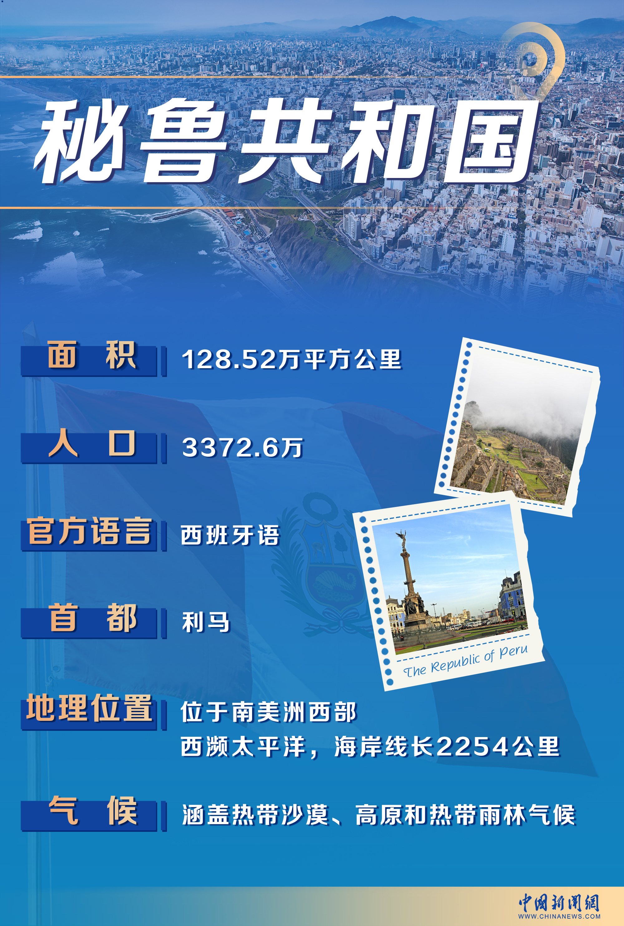 秘魯位于南美洲西部,西瀕太平洋,擁有2254公里的海岸線。首都是歷史悠久的利馬,全國(guó)人口達(dá)3372.6萬(wàn),官方語(yǔ)言為西班牙語(yǔ)。