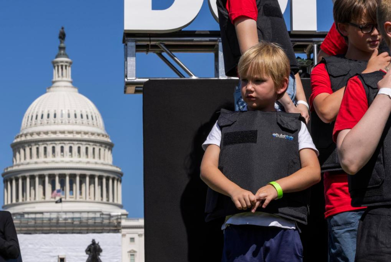 2022年6月6日,學生們身穿防彈衣在美國華盛頓的國會大廈前參加名為“不要回避”的抗議活動,呼吁立法機構正視美國槍擊案頻發(fā)的社會問題,要求加強槍支管控立法。新華社發(fā)(亞倫攝)