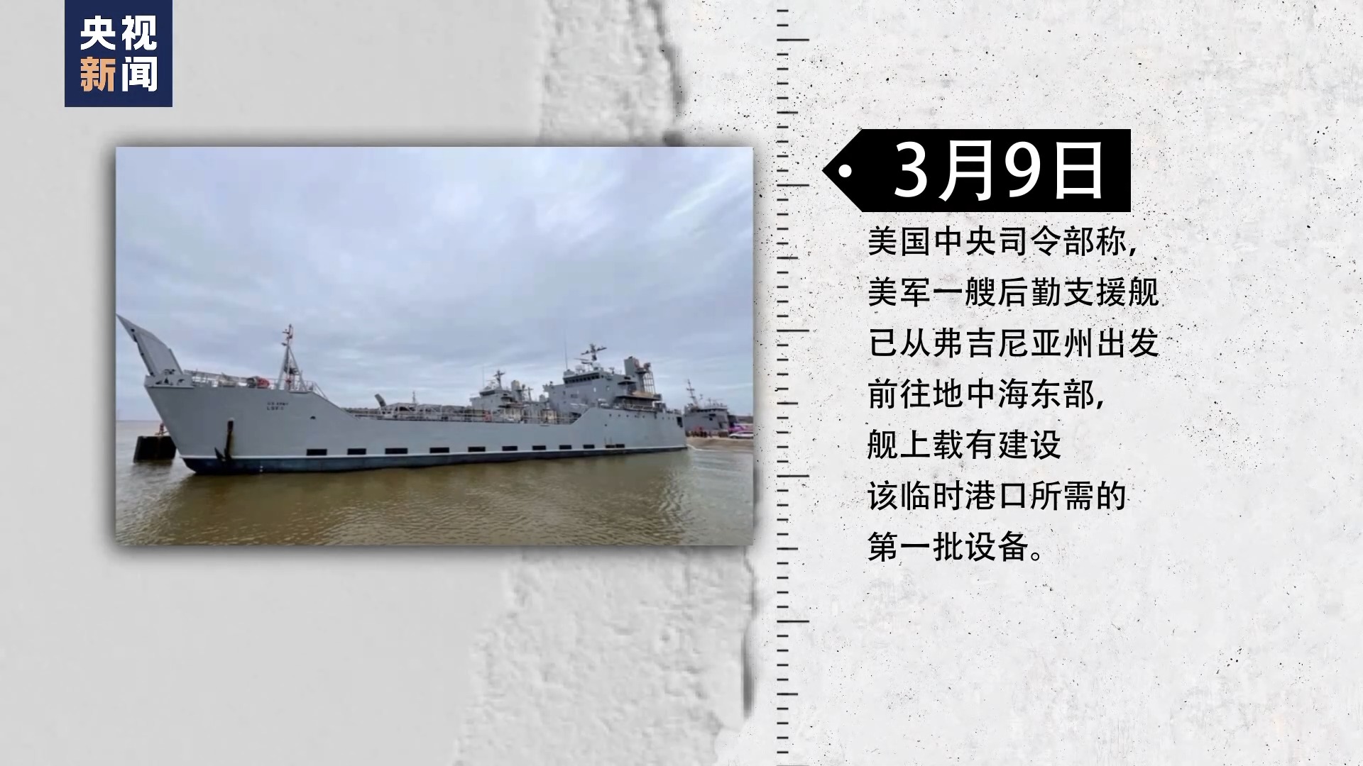 3月9日,美國中央司令部稱,美軍一艘后勤支援艦已從弗吉尼亞州出發(fā)前往地中海東部,艦上載有建設(shè)該臨時港口所需的第一批設(shè)備。