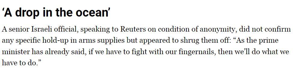 △卡塔爾半島電視臺網(wǎng)站:雖然內塔尼亞胡政府嘴里說氣話,但其實心里不以為然,因為與美國提供給以色列的巨量武器相比,暫停運送的武器只是“滄海一粟”。
